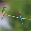 蓝喉蜂是蜂虎科蜂虎属鸟类。体长26-28厘米,嘴长而弯曲,有明显细长的中央尾羽。头部、颈部和背部为巧克力色,有黑色眼纹。喉部、腰部和尾羽为蓝色。腹部和两翼为绿色。幼鸟外观似成鸟,头部、颈部和背部为绿色,…全部>>