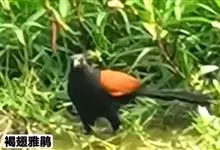 褐翅鸦鹃,是鹃形目鸦鹃科鸦鹃属的鸟类。褐翅鸦鹃的身体为黑色;头颈和胸带蓝紫色金属光泽并具黑亮的羽干纹,下胸至腹部泛金属绿光泽;两翼和肩部为棕栗色,外侧飞羽具暗色羽端,尾羽闪铜绿色光泽;虹膜赤红色,…全部>>