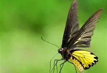 金裳凤蝶是凤蝶科、裳凤蝶属的动物。金裳凤蝶身体呈黑色,头、颈和胸侧有红毛,腹部有黑黄两色相间条纹,雄蝶前翅黑色,具黑天鹅绒光泽,各脉两侧灰白色,后翅金黄色,各室外缘有等腰三角形黑斑1枚,斑内侧有晕,…全部>>