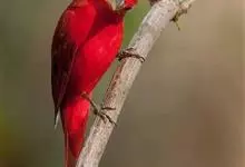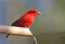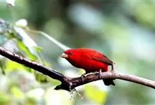 普通朱雀是雀形目雀科朱雀属鸟类,又名红朱雀、马料、青麻料。雄鸟上体红色,下体淡红色;头部、喉部、胸部及腰部亮红色;背部褐色染红色;两翼及尾黑褐色,羽缘染红色。雌鸟上体橄榄褐色,下体近白色,…全部>>