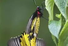 金裳凤蝶是凤蝶科、裳凤蝶属的动物。金裳凤蝶身体呈黑色,头、颈和胸侧有红毛,腹部有黑黄两色相间条纹,雄蝶前翅黑色,具黑天鹅绒光泽,各脉两侧灰白色,后翅金黄色,各室外缘有等腰三角形黑斑1枚,斑内侧有晕,…全部>>