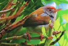 普通缝叶莺,是雀形目鹅科莺亚科缝叶莺属一种。体长10-14厘米,体重7-10克,雄鸟前额棕红,头顶至枕棕橄榄褐,上体橄榄绿染黄,飞羽及尾羽暗褐;繁殖期雄鸟的中央尾羽特形延长,下体淡皮黄白色。…全部>>