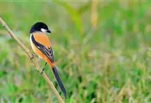 点胸鸦雀是莺科、鸦雀属小型鸟类,体长18-21厘米。头顶至枕橙棕色,嘴橙黄色、短而粗厚,脸皮黄色,耳覆羽和颊后部黑色,眼圈白色。上体棕褐色。颏黑色,其余下体淡皮黄白色,喉和上胸具黑色矢状斑。…全部>>