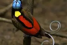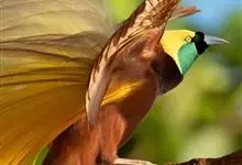 大极乐鸟是极乐鸟属中最大的鸟种。成年雄鸟体长可达到43厘米,雌性可达35厘米。雄鸟的额、颊、喉等墨绿色;头、颈黄色;上体暗赤栗色;腹部葡萄红色,胁部有长饰羽,其基部橙黄,中部黄色,…全部>>