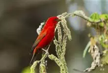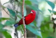 血雀雀科朱雀属鸟类,体重36-49克;体长155-182毫米。雄鸟除眼先、翼与尾为黑色外,通体为鲜红色;嘴鲜黄;雌鸟暗橄榄绿色,羽端较淡或带黄色;腰鲜黄;嘴较暗。虹膜褐色;嘴黄色;腿和脚褐色。…全部>>