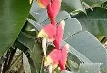金嘴蝎尾蕉:芭蕉科,蝎尾蕉属多年生草本植物。株高可达6米。叶片长圆形,叶面绿色,叶背亮紫色;顶生花序,直立,薄被短柔毛;苞片绿色,开放时突露,花被片红色,顶端绿色,狭圆柱形,果三棱形,灰蓝色,有种子…全部>>