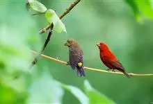 普通朱雀是雀形目雀科朱雀属鸟类,又名红朱雀、马料、青麻料。雄鸟上体红色,下体淡红色;头部、喉部、胸部及腰部亮红色;背部褐色染红色;两翼及尾黑褐色,羽缘染红色。雌鸟上体橄榄褐色,下体近白色,…全部>>