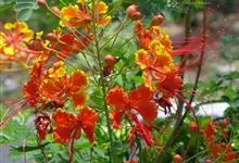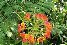 洋金凤 Sw.),豆科小凤花属灌木状或小乔木植物,枝无毛,绿或粉绿色;二回羽状复叶;总状花序伞房状,萼片无毛,花瓣橙红或黄色,圆形,花丝红色,子房无毛,花柱橙黄色;荚果窄而薄,…全部>>