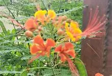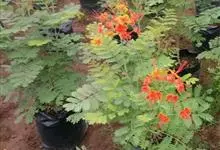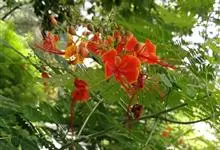 洋金凤 Sw.),豆科小凤花属灌木状或小乔木植物,枝无毛,绿或粉绿色;二回羽状复叶;总状花序伞房状,萼片无毛,花瓣橙红或黄色,圆形,花丝红色,子房无毛,花柱橙黄色;荚果窄而薄,…全部>>