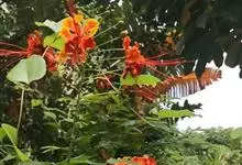 洋金凤 Sw.),豆科小凤花属灌木状或小乔木植物,枝无毛,绿或粉绿色;二回羽状复叶;总状花序伞房状,萼片无毛,花瓣橙红或黄色,圆形,花丝红色,子房无毛,花柱橙黄色;荚果窄而薄,…全部>>