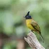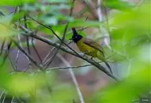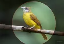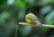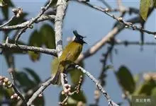 黑冠黄鹎:体长18-21厘米,是一种中等体型偏黄色鹎。整个头、颈、颏、喉黑色,头顶有显著直立的羽冠,黑色,上体褐橄榄黄绿色,下体橄榄黄色。虹膜偏红;嘴及脚黑色。…全部>>