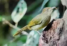 黄绿鹎,小型鸟类,体长19-22厘米。额至头顶暗褐具灰色羽缘,眼先黑色,其上面有一粗著的白纹从鼻后至眼,在黑色的头部极为醒目。上体橄榄绿褐色。颏、喉淡灰色或灰白色,胸灰褐色具橄榄黄色羽缘,…全部>>