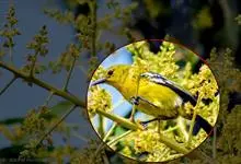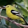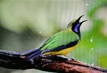 蓝翅叶鹎:小型鸟类,体长15-18厘米。雄鸟通体草绿色,尾蓝绿色,肩和翅亮蓝 色,胸缀有黄色,颏、喉黑色。雌鸟颏,喉蓝绿色。栖息在海拔1500米以下的常绿阔叶林、次生林和林缘疏林灌丛中。…全部>>