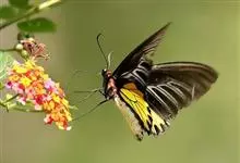 金裳凤蝶是凤蝶科、裳凤蝶属的动物。金裳凤蝶身体呈黑色,头、颈和胸侧有红毛,腹部有黑黄两色相间条纹,雄蝶前翅黑色,具黑天鹅绒光泽,各脉两侧灰白色,后翅金黄色,各室外缘有等腰三角形黑斑1枚,斑内侧有晕,…全部>>