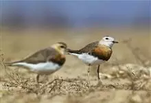 东方鸻:属小型涉禽。体重80-95克,体长220-255毫米。在夏季,前额、眉纹和头的两侧白色,头顶、背褐色或沙褐色。颏、喉白色,前颈棕色,胸棕栗色,其下有一黑色胸带紧靠其后,其余下体白色。嘴细长,…全部>>