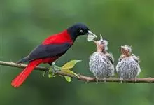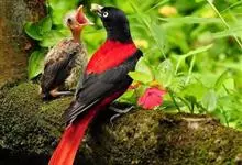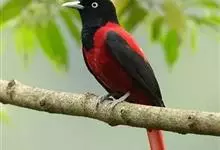 朱鹂:中等鸟类,体长23-28厘米。雄鸟绛紫红色,头、上胸及翼黑色。雌鸟上背及背部深灰色,尾覆羽及尾绛紫红色,腹部及下胸白而密布黑色纵纹。与鹊色鹂幼鸟的区别在上背灰色较深,下体白色较少且纵纹较粗。…全部>>