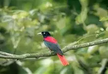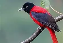 朱鹂:中等鸟类,体长23-28厘米。雄鸟绛紫红色,头、上胸及翼黑色。雌鸟上背及背部深灰色,尾覆羽及尾绛紫红色,腹部及下胸白而密布黑色纵纹。与鹊色鹂幼鸟的区别在上背灰色较深,下体白色较少且纵纹较粗。…全部>>