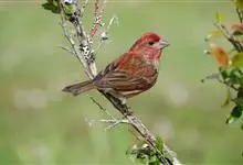 酒红朱雀小型鸟类,体长13~15厘米。雄鸟通体深红色,头部深朱红或棕红色,下背和腰玫瑰红色,眉纹粉红色而具丝绢光泽。两翅和尾黑褐或灰褐色、具暗红色狭缘,内侧两枚三级飞羽具淡粉红色先端。…全部>>