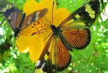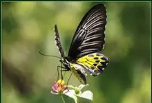 金裳凤蝶是凤蝶科、裳凤蝶属的动物。金裳凤蝶身体呈黑色,头、颈和胸侧有红毛,腹部有黑黄两色相间条纹,雄蝶前翅黑色,具黑天鹅绒光泽,各脉两侧灰白色,后翅金黄色,各室外缘有等腰三角形黑斑1枚,斑内侧有晕,…全部>>