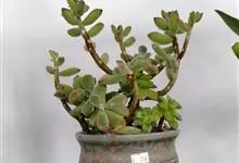 仙女之舞是景天科、伽蓝菜属植物。常绿肉质灌木,株高可达2-3米。幼株茎上有毛。叶有柄;单叶对生,阔卵状三角形,肉质;新叶开展,老叶正面凹、背面圆凸,缘具稀锯齿,橄榄绿色至灰绿色,被稠密的灰白色毛。…全部>>