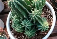 魁伟玉原产南非,是一种大戟科的多年生肉质植物,植株具粗圆筒形肉质茎,有10条以上的突出棱,表皮绿色至灰绿色,披有白粉,有较为明显、平行排列的深色横肋,刺生于棱缘上,红褐至深褐色,易脱落。小叶早脱落,…全部>>