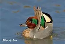 绿翅鸭是小型鸭类,体长37厘米,体重约0.5千克。嘴脚均为黑色。雄鸟头至颈部深栗色,头顶两侧从眼开始有一条宽阔的绿色带斑一直延伸至颈侧,尾下覆羽黑色,两侧各有一黄色三角形斑,在水中游泳时,极为醒目。…全部>>