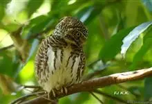 鬼鸮是鸟纲鸱鸮科的鸟类, 全长23-26厘米。共有6个亚种。雌雄羽色相同。额、头顶及枕部褐色,有白色椭圆斑。面盘白色外侧羽缘褐色。胸以下为白色,有褐色纵斑。翅褐色。…全部>>