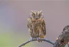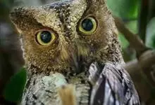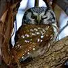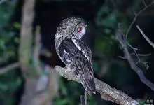 鬼鸮是鸟纲鸱鸮科的鸟类, 全长23-26厘米。共有6个亚种。雌雄羽色相同。额、头顶及枕部褐色,有白色椭圆斑。面盘白色外侧羽缘褐色。胸以下为白色,有褐色纵斑。翅褐色。…全部>>