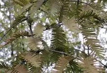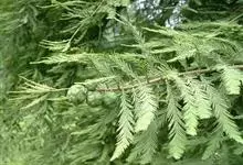 落羽杉 Rich.),杉科落羽杉属木本植物。树干尖削度大,基部通常膨大,具膝状呼吸根,树皮棕色,裂成长条片;一年生小枝褐色,侧生短枝;叶线形;球果具短柄,熟时淡褐黄色,被白粉;花期3月;球果10月成熟。…全部>>