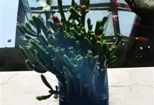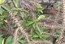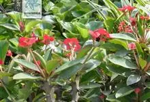 虎刺梅:别称铁海棠,是蔓生灌木植物。茎多分枝,长60-100厘米,直径5-10毫米,具纵棱,密生硬而尖的锥状刺,刺长1-1.5厘米,直径0.5-1.0 毫米,常呈3-5列排列于棱脊上,呈旋转。叶互生…全部>>