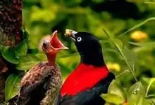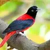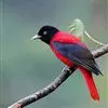 朱鹂:中等鸟类,体长23-28厘米。雄鸟绛紫红色,头、上胸及翼黑色。雌鸟上背及背部深灰色,尾覆羽及尾绛紫红色,腹部及下胸白而密布黑色纵纹。与鹊色鹂幼鸟的区别在上背灰色较深,下体白色较少且纵纹较粗。…全部>>