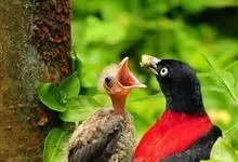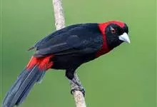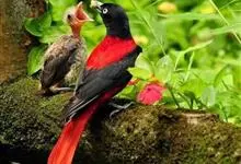 朱鹂:中等鸟类,体长23-28厘米。雄鸟绛紫红色,头、上胸及翼黑色。雌鸟上背及背部深灰色,尾覆羽及尾绛紫红色,腹部及下胸白而密布黑色纵纹。与鹊色鹂幼鸟的区别在上背灰色较深,下体白色较少且纵纹较粗。…全部>>