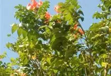火焰树是紫葳科、火焰树属乔木,树皮平滑,灰褐色。奇数羽状复叶,对生,连叶柄长达45厘米;小叶13-17枚,叶片椭圆形至倒卵形,伞房状总状花序,顶生,密集;被褐色微柔毛,具有明显的皮孔;花冠一侧膨大,…全部>>