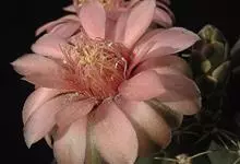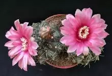 绯花玉 Speg.)是仙人掌科、裸萼球属多肉植物,植株呈扁球形,表皮墨绿色,刺针状,每个刺座有5枚灰色周刺,花生于球体顶端,夏季开花,花色有白、粉红、深红等。果实纺锤形,深灰绿色,种子黑色。…全部>>