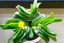 宝绿中文学名弯叶日中花,拉丁文名Mesembryanthemum uncatum Salm-Dyck,又名舌叶花、佛手掌。叶片宽而厚实,呈长条形,似动物的舌头,别名也由此而来,…全部>>