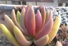 乒乓福娘,植株叶片退化成扁卵状,植株为直立的肉质灌木,能够长高。叶片对生,扁卵型至圆卵形,叶片顶端紫红圆叶尖,叶面有一层白粉。强光下叶片的顶端边缘会较红。初夏开花,聚伞状圆锥花序,花序较高,小花管状…全部>>