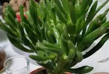 筒叶花月,是景天科青锁龙属的多年生草本植物。植株多分株,灌木状,茎较粗壮,圆柱形,表皮灰褐色;叶片肉质,互生,呈圆筒状,簇生于茎或分枝顶端,叶端呈斜截形,截面为椭圆形;花呈星状,淡白色;花期秋季。…全部>>