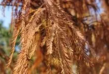 落羽杉 Rich.),杉科落羽杉属木本植物。树干尖削度大,基部通常膨大,具膝状呼吸根,树皮棕色,裂成长条片;一年生小枝褐色,侧生短枝;叶线形;球果具短柄,熟时淡褐黄色,被白粉;花期3月;球果10月成熟。…全部>>