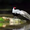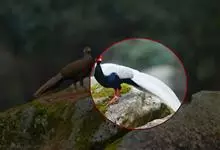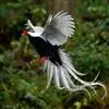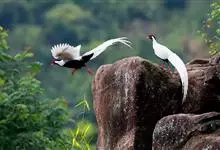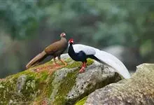 白鹇,是鸡形目雉科鹇属的一种留鸟。雄鸟上体白色并具黑色纹,下体黑色,头顶具黑色长羽冠,尾白而长;雌鸟体型较小,以橄榄褐色为主,下体具白色或皮黄色细纹;虹膜褐色,眼周具红色裸皮,喙黄色,脚鲜红色。…全部>>