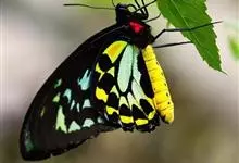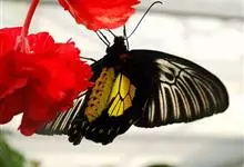 金裳凤蝶是凤蝶科、裳凤蝶属的动物。金裳凤蝶身体呈黑色,头、颈和胸侧有红毛,腹部有黑黄两色相间条纹,雄蝶前翅黑色,具黑天鹅绒光泽,各脉两侧灰白色,后翅金黄色,各室外缘有等腰三角形黑斑1枚,斑内侧有晕,…全部>>