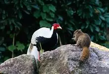 环颈雉是雉科、雉属的一种走禽,共有30个亚种。体重900-1050克,体长53-89厘米。体型较家鸡略小,但尾巴却长得多。雄鸟和雌鸟羽色不同,雄鸟羽色华丽,多具金属反光,…全部>>