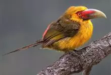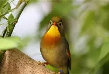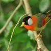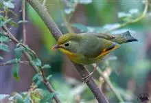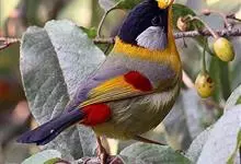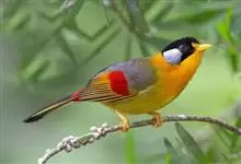 银耳相思鸟小型鸟类,体长14~18厘米。头顶黑色,耳羽银灰色,前额橙黄色;外侧飞羽橙黄色,基部朱红色,极为鲜艳、醒目。尾圆形,尾上、尾下覆羽朱红色,尾暗灰褐色,外侧尾羽橙黄色,其余上体橄榄绿或橄榄黄色。…全部>>