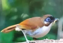 棕噪鹛中型鸟类,体长25~28厘米。上体赭褐色,头顶具黑色羽缘,尾上覆羽灰白色,尾羽棕栗色,外侧尾羽具宽阔的白色端斑。额、眼先、眼周、耳羽上部、脸前部和颏黑色,眼周裸皮蓝色,极为醒目。喉和上胸与背同色,…全部>>