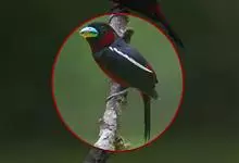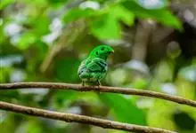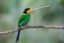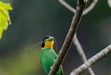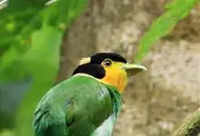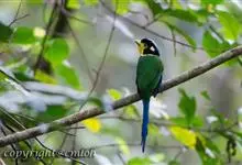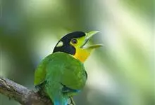 长尾阔嘴鸟是雀形目阔嘴鸟科的鸟类,体长约25厘米,是绿色阔嘴鸟。形长的楔形尾蓝色,喉及脸黄色,顶冠及颈背黑色。两翼黑并具显著的蓝色斑块。头顶具蓝色小点斑,眼后有一黄色点斑。亚成鸟多为绿色。结群活动于…全部>>