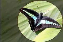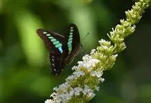 青带凤蝶Graphium sarpedon ,又名青凤蝶,是最普遍的中型凤蝶,飞行速度很快。青带凤蝶的翅膀中央有许多浅蓝色的斑点,很整齐地排列成一条直线。这些斑点由上而下逐渐变大,就像一条青色的带子。全部>>