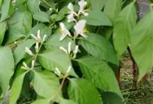 山银花在华南地区野外山林生长。木质藤本,长2~5m。树皮黄褐色渐次变为白色,嫩时有短柔毛。叶对生,卵圆形至椭圆形,长4~8cm,宽3.5~5cm,上面绿色,主脉上有短疏毛,下面带灰白色,密生白色短柔…全部>>