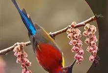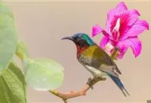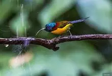 绿喉太阳鸟:共有9个亚种。小型鸟类,雄鸟体长13-15厘米、雌鸟10-12厘米。雄鸟前额至后颈、颏和喉辉绿色,头侧黑色,颈侧和背暗红色,两肩、下背橄榄绿色,腰鲜黄色,尾上覆羽和中央尾羽暗绿色,…全部>>