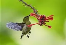 叉尾太阳鸟,雀形目太阳鸟科太阳鸟属留鸟;为小型鸟类,雄鸟头顶辉蓝绿色,上体橄榄绿色,腰明黄色,中央尾羽亮翠蓝色,羽轴针状延长,外侧尾羽黑色具白色端斑,头侧黑色,颜、喉和胸为绛红色,…全部>>
