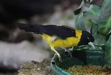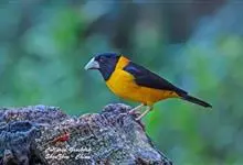 黄颈拟蜡嘴雀:小型鸟类,体长20-22厘米。嘴粗大,黑色。雄鸟整个头、颈、颏、喉和上胸辉黑色,两翅和尾亦为黑色,其余上体橙黄色,下体鲜黄色。雌鸟头、颈、颏、喉和上胸中央灰色或暗灰色,…全部>>