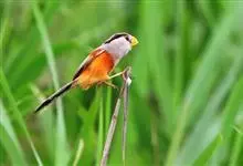 点胸鸦雀是莺科、鸦雀属小型鸟类,体长18-21厘米。头顶至枕橙棕色,嘴橙黄色、短而粗厚,脸皮黄色,耳覆羽和颊后部黑色,眼圈白色。上体棕褐色。颏黑色,其余下体淡皮黄白色,喉和上胸具黑色矢状斑。…全部>>